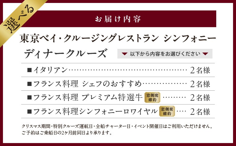 - ディナークルーズ 2名さま 各コース (イタリアン・フランス料理) │ 東京 都内 東京湾 お台場 クルージング 観光 旅行 体験 デート 記念日 誕生日 船上 遊覧 景色 絶景 フレンチ ペア チケット 乗船券 食事券 ギフト 贈り物