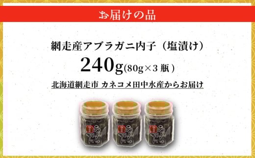 網走産アブラガニ内子(塩漬け)80g×3【 ふるさと納税 人気 おすすめ ランキング アブラガニ 蟹 かに カニ 内子 塩漬け 北海道産 網走産 手軽 小分け おかず おつまみ オホーツク 北海道 網走市 送料無料 】 ABR034