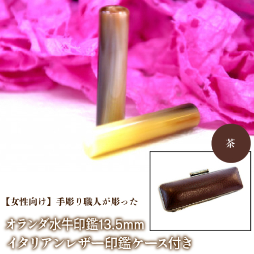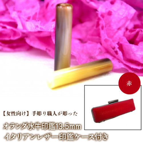 【女性向け】手彫り職人が彫ったオランダ水牛印鑑13.5mm イタリアンレザ−印鑑ケース付き FCH009
