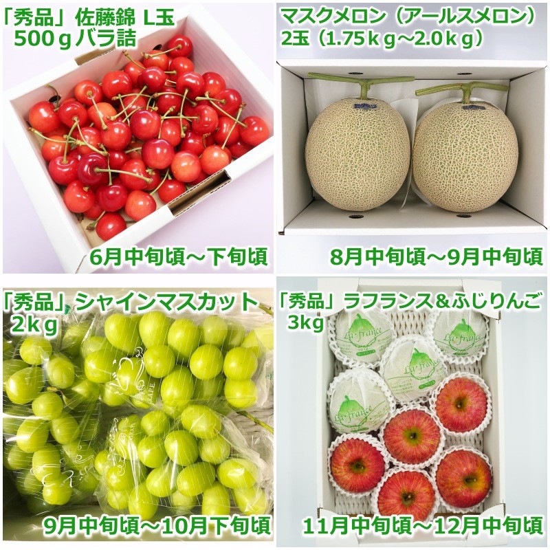 - 【2026年発送】【定期便4回】山形旬の果物5選(佐藤錦/メロン/シャインマスカット/ラ・フランス&ふじりんごセット)_H149(R8)