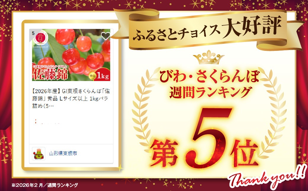 - 【2026年産】 GI東根さくらんぼ「佐藤錦」 秀品 Lサイズ以上 1kgバラ詰め(500g×2パック) 山形県 東根市 フルーツピッカー提供 hi097-014