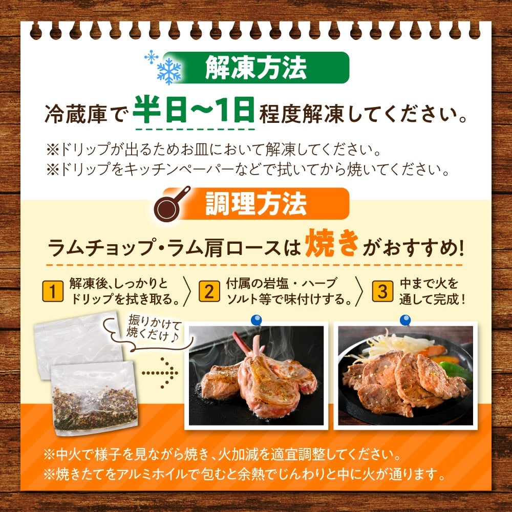 生ラム肩ロース300g、生ラムショルダー300g、ラムショルダーロール600g(味付けなし300g、味付けあり300g)