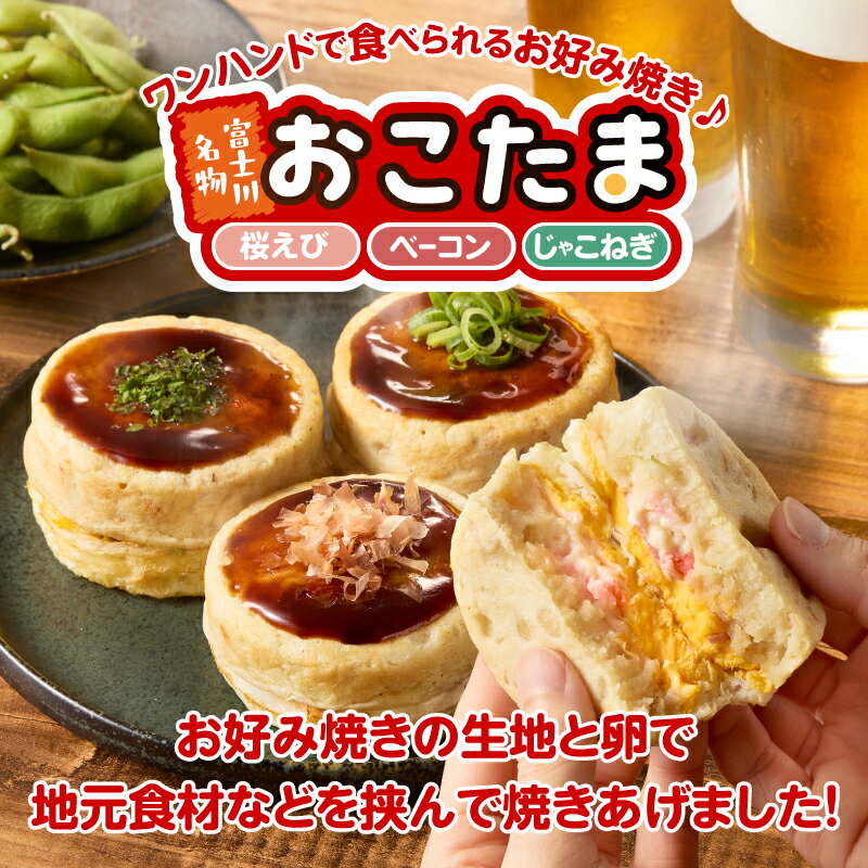 - 【ふるさと納税】 富士川名物 おこたま(12個入) ワンハンド お好み焼き 桜えび ベーコン じゃこねぎ 各4個 懐かしい 朝市 名物フード ソウルフード おやつ 軽食 おかず グルメ 冷凍配送 静岡県 富士市 [sf001-357]