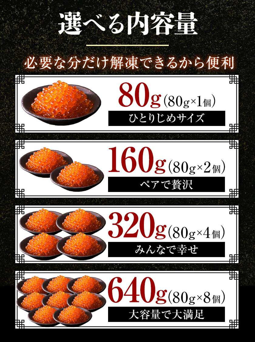- 【ふるさと納税】いくら 醤油漬け 選べる 80g 160g 320g 640g 源すし《60日以内に出荷予定(土日祝除く)》北海道 本別町 送料無料 十勝 イクラ 魚介類 魚卵 海の幸 筋子 特選 大粒