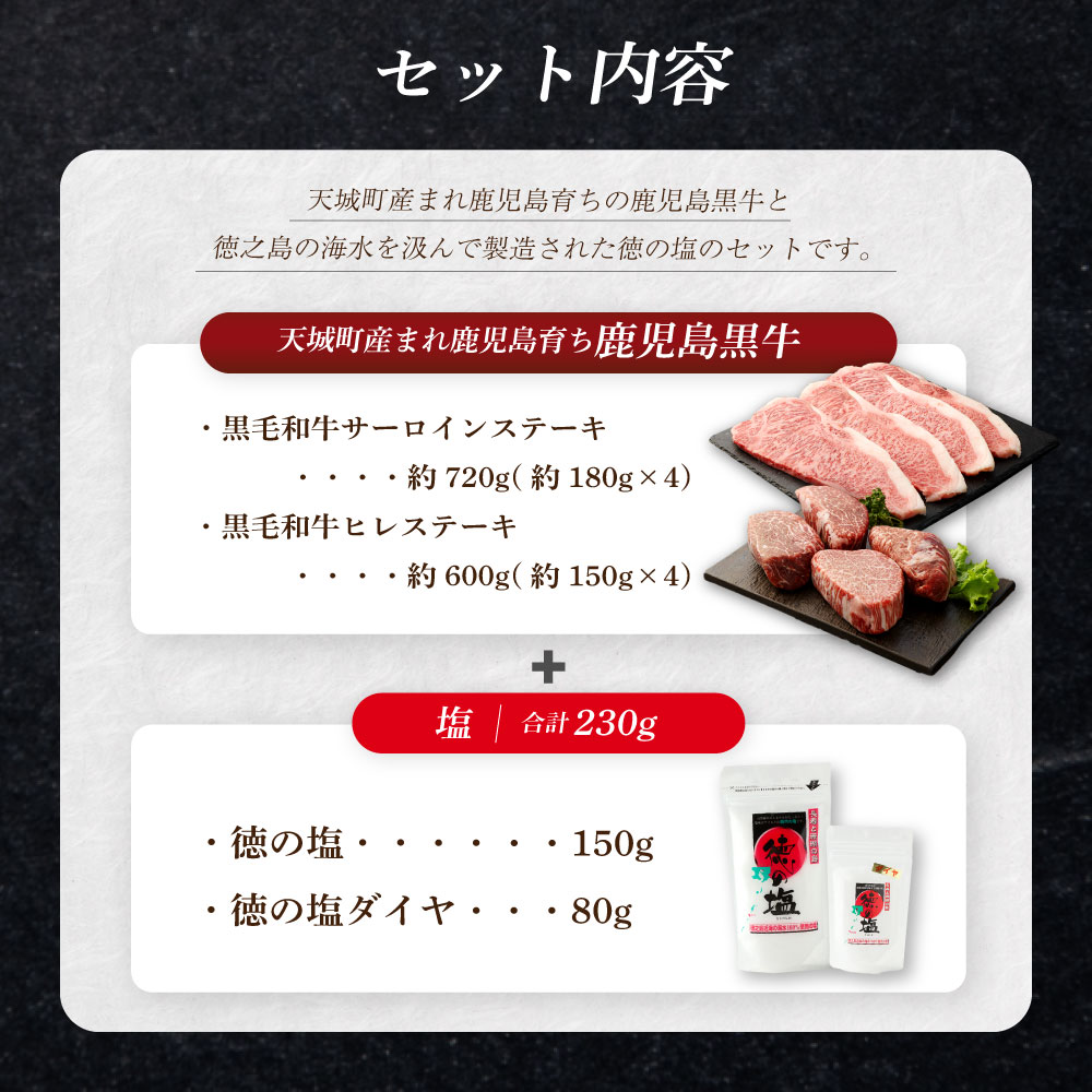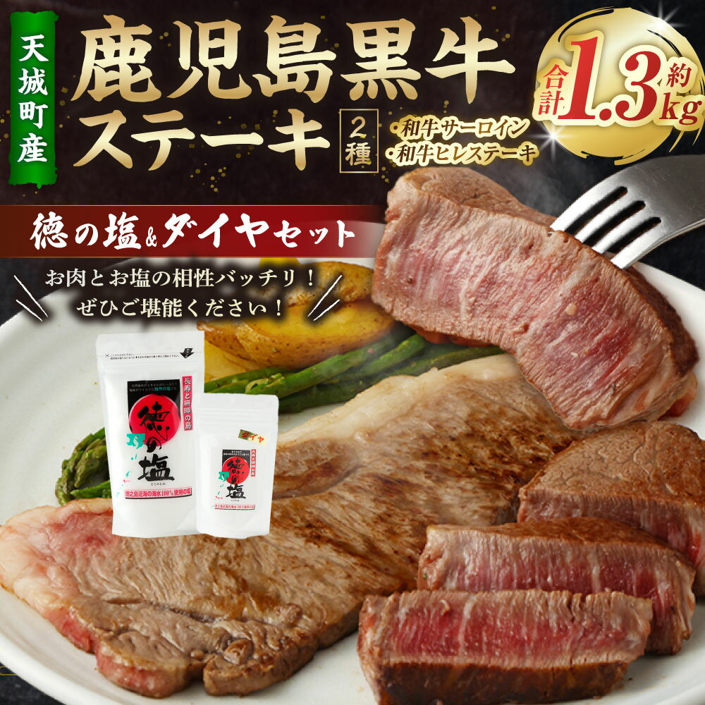 【ふるさと納税】【セット】 天城町産 鹿児島育ち 鹿児島 黒牛 ステーキ 2種 セット (合計約1.3kg) 徳の塩・ダイヤ セット 計約230g 総計約1.53kg 黒毛和牛 サーロインステーキ ヒレステーキ 国産 焼き肉 BBQ バーベキュー 牛肉 塩 ソルト 海塩 鹿児島県 天城町 送料無料