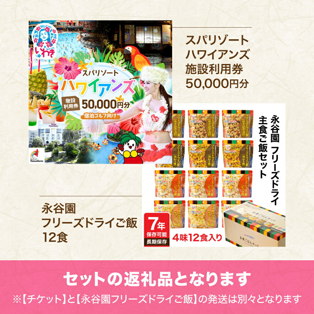- 【ふるさと納税】スパリゾート ハワイアンズ 宿泊ゴルフプラン 施設利用券50,000円分(5,000円分×10枚)+【7年保存可能】永谷園主食ご飯セット フリーズドライご飯12食入り | 利用チケット 入場券 ホテルハワイアンズ フラダンス 福島県 いわき市 ゴルフコース | ZZ028