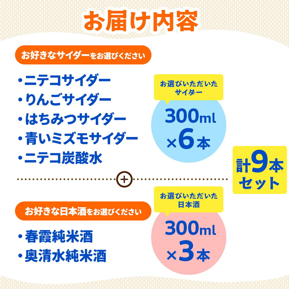 【ふるさと納税】炭酸飲料 【選べる炭酸飲料:ニテコサイダー/りんごサイダー/はちみつサイダー/青いミズモサイダー/ニテコ炭酸水】6本と【選べる日本酒:春霞純米酒/奥清水純米酒】3本のセット