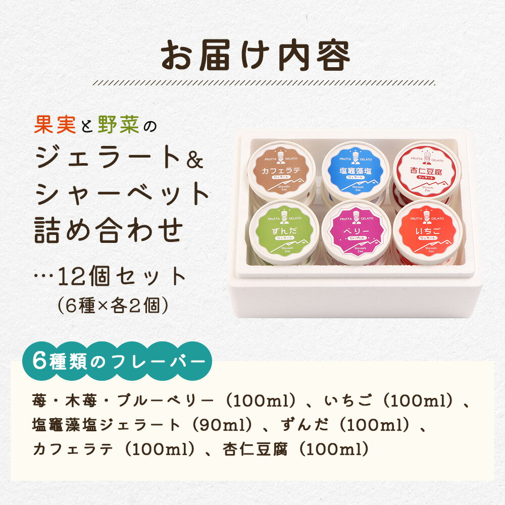 - 【ふるさと納税】果実と野菜のジェラート&シャーベット詰め合わせ 12個セット(6種×各2個) | ジェラート シャーベット 地元 野菜 果物 手作り スイーツ こだわり 枝豆 いちご ブルーベリー カフェラテ 塩スイーツ ご当地スイーツ お取り寄せ 宮城県 白石市【14153】