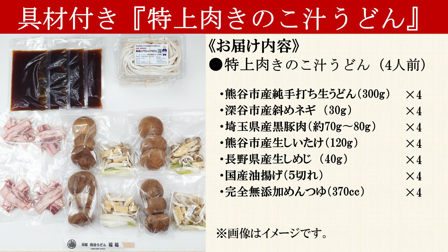 【ふるさと納税】【特上肉きのこ汁うどん(彩の国黒豚・熊谷市産生しいたけ三人前・国産油揚げ100%)】(4人前)TV番組『バナナマンのせっかくグルメ』紹介店!TV出演多数!熊谷市産小麦『あやひかり』100%使用! 国産 無添加 化学調味料・保存料不使用 手打ち TV紹介店