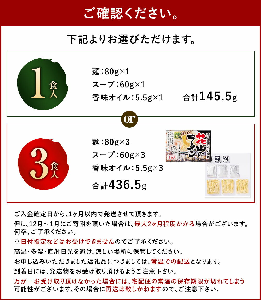 - 【ふるさと納税】花山のラーメン 〈選べる内容量〉1食 / 3食 麵 スープ 香味オイル付き 博多屋台 ラーメン 拉麺 豚骨 豚骨ラーメン とんこつラーメン 極細 ストレート麺 福岡県 大任町 送料無料