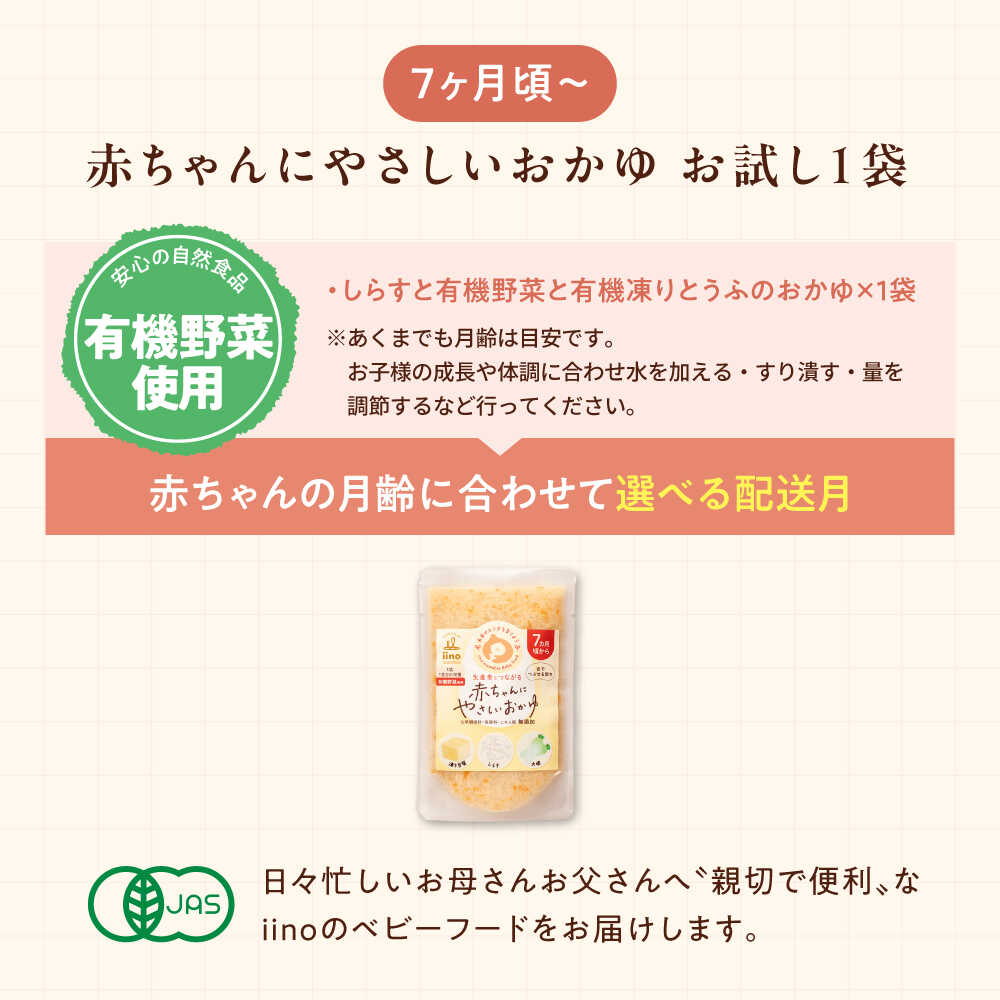 - 【ふるさと納税】離乳食【先行予約】【1月下旬から順次発送】【お試し1袋】7ヶ月頃からの『赤ちゃんにやさしいおかゆ』(しらすと有機野菜と有機凍りとうふのおかゆ)1袋 大洲市/iino assemble[AGAA020] ベビーフード 赤ちゃん用品 お食い初め 国産 4000円 四千円