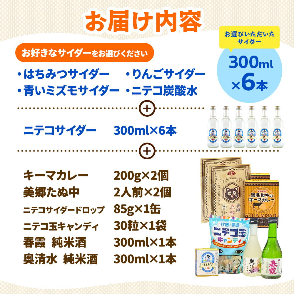 【ふるさと納税】炭酸飲料 ニテコサイダー6本と【選べる炭酸飲料:りんごサイダー/はちみつサイダー/青いミズモサイダー/ニテコ炭酸水】6本と美郷の美味しいものセット