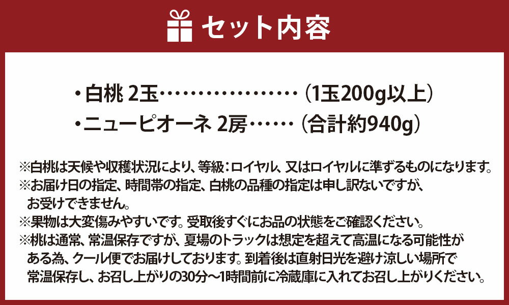 - 【ふるさと納税】桃 ぶどう 先行予約 果物詰合せ 白桃 2玉(1玉200g以上)・ ニューピオーネ 2房(合計約940g) 化粧箱入り | 岡山県産 国産 フルーツ 岡山県産 贈答用 果汁 甘い 酸味 岡山県 倉敷市 送料無料 【2026年7月上旬~8月上旬迄順次発送予定】