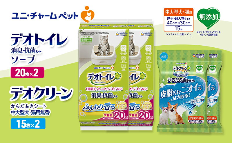 - 【ふるさと納税】デオトイレ 消臭・抗菌 シート ナチュラルソープ 20枚×2 デオクリーン からだふきシート 中大型犬・猫用 無香 15枚×2 ペットシーツ ペットシート トイレ 猫 猫用トイレ ペット 清潔 ユニ・チャーム お届け:通常ご寄附頂いてから約1~2ヶ月以内に発送