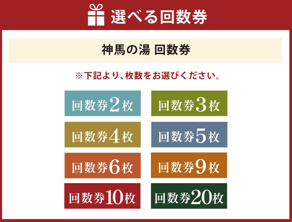 - 【ふるさと納税】<選べる枚数>神馬の湯 回数券 2枚 / 3枚 / 4枚 / 5枚 / 6枚 / 9枚 / 10枚 / 20枚 深湯温泉 天然温泉 遠赤外線サウナ ロウリュウ岩盤浴 スチーム岩盤浴 プロジェクション岩盤浴 露天風呂 入浴券 施設利用券 商品券 チケット 旅行 日帰り 送料無料