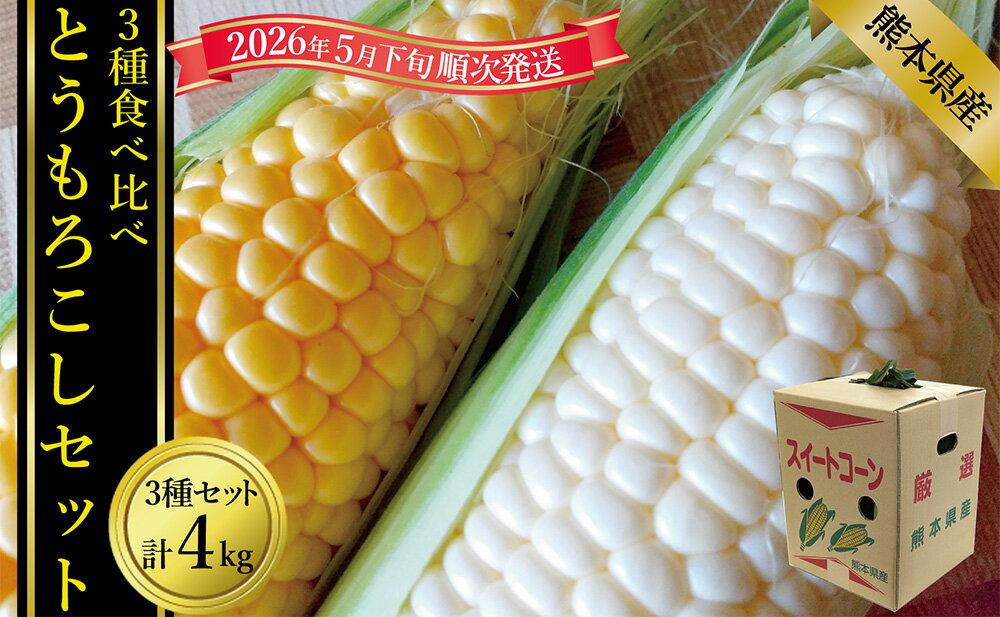 - 【ふるさと納税】とうもろこし3種食べ比べ(スイートコーン/ゴールドラッシュ/ピュアホワイト等) 合計:約4kg セット とうもろこし トウモロコシ 野菜 やさい サラダ スープ ゆで 蒸し 焼き 冷蔵 家庭用 贈答 ギフト 国産 九州 熊本県産 送料無料 【2026年5月下旬発送開始】