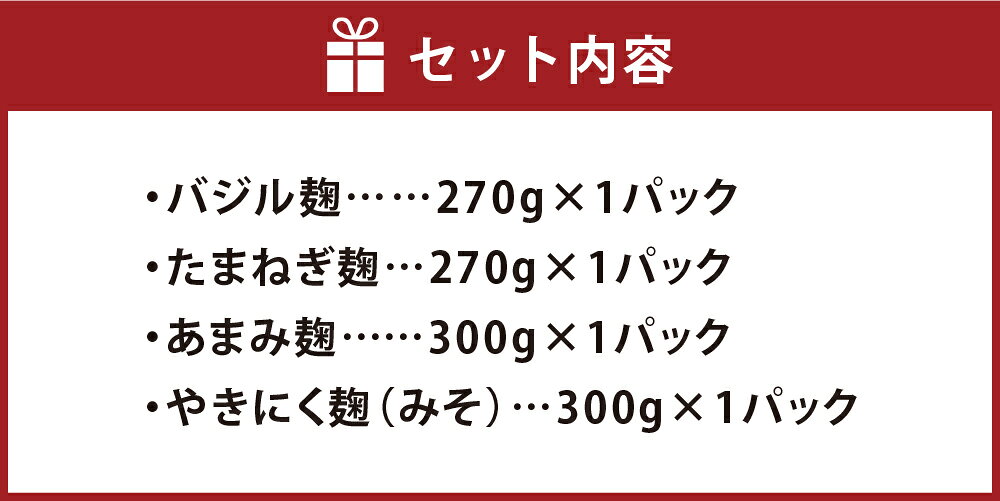 【ふるさと納税】人気セット 4点入り バジル麹・たまねぎ麹・あまみ麹・やきにく麹(みそ) 各1パック 計1.14kg 米麹 米こうじ 国産米 オリーブオイル 玉ねぎ タマネギ 味噌 焼肉 無添加 発酵調味料 発酵食品 着色料・保存料・化学調味料・甘味料・香料不使用 冷蔵 送料無料