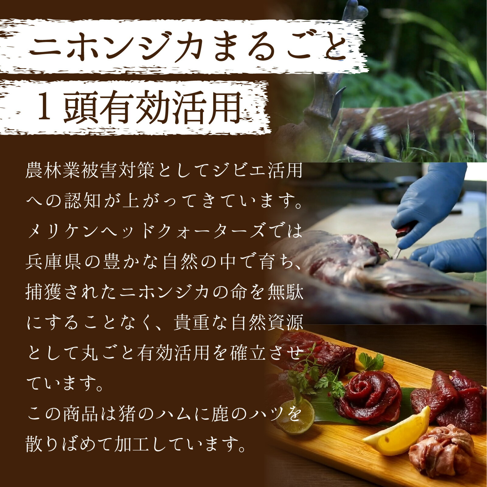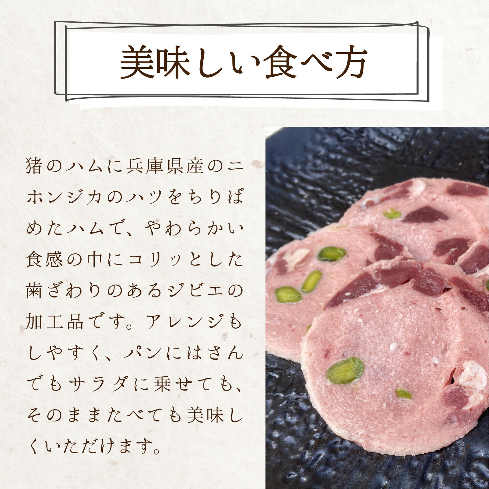 - 【ふるさと納税】ヘルツヴルスト 140g (70g × 2個) 鹿のハツをちりばめた猪のハム / 国産 鹿肉 猪肉 ハツ 心臓 ジビエ ハム カプレーゼ パン サラダ 鹿 二ホンジカ 兵庫県