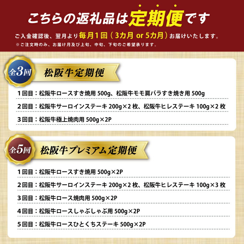 - 【ふるさと納税】 松阪牛 定期便 えらべる 全3回 プレミアム全5回 友屋本店 すき焼き ステーキ 焼肉 極上の柔らかさ 柔らかい 霜降り ブランド牛 国産 冷凍 ロース リブロース 焼きしゃぶ 牛肉 和牛 松坂牛 三重県 A4 A5 NT10 NT11