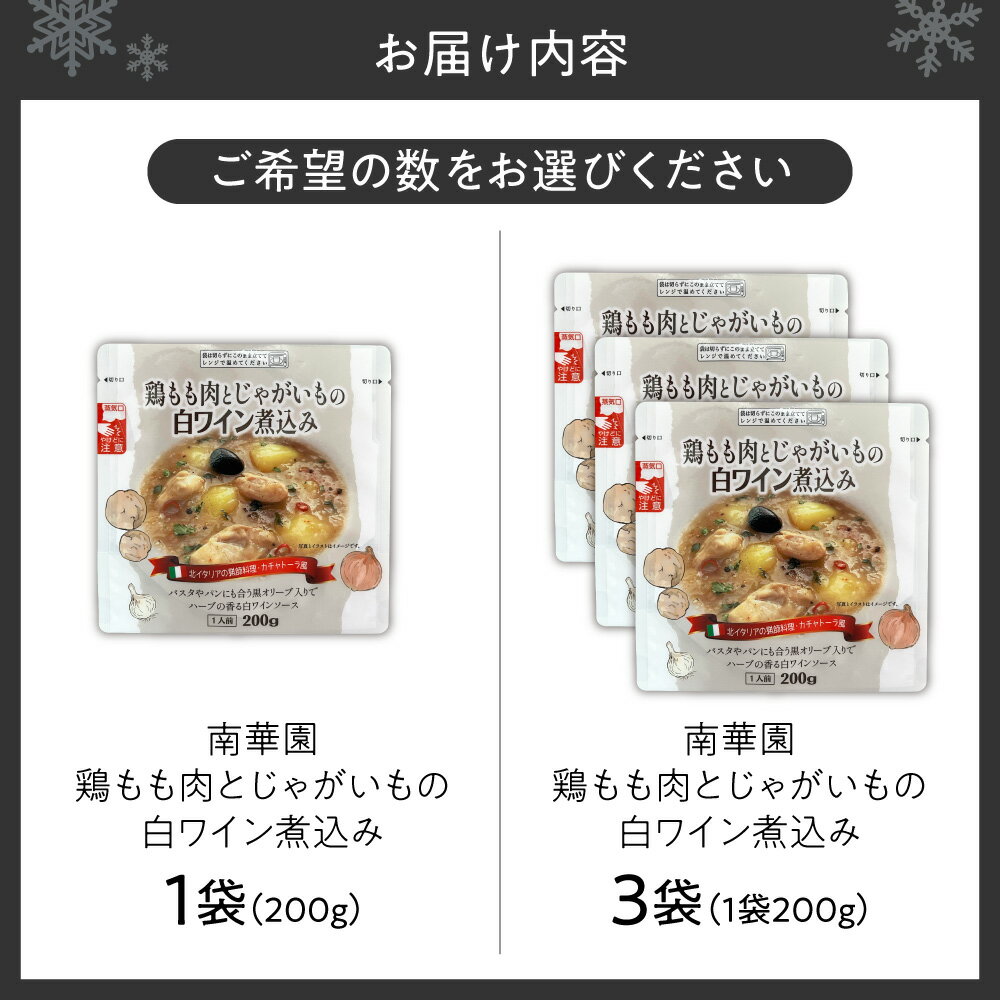 - 【ふるさと納税】 白ワイン 煮込み 北海道産 鶏もも肉 じゃがいも 【 選べる 数量 】 200g入り 1袋 3袋 南華園 レトルト 北イタリア 猟師料理 カチャトーラ 白ワインソース お取り寄せ グルメ 惣菜 時短 簡単調理 レンジ レンチン 常備食 湯煎 北海道 札幌市