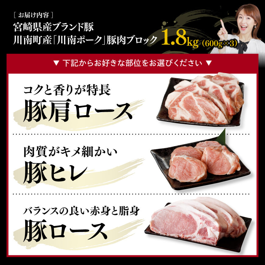 【ふるさと納税】※部位が選べる※宮崎県産ブランド豚 川南町産「川南ポーク」豚肉ブロック1.8kg(600g×3) - 宮崎県産(川南町産) 肉 ヒレ 真空急速冷凍 送料無料 E5001 E5002 E5003
