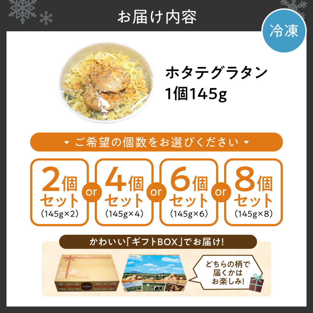 - 【ふるさと納税】 ホタテグラタン 【 選べる 個数 】 2個 4個 6個 8個 各145g セット 北海道産 ほたて ホタテ 帆立 マカロニ グラタン 冷凍 貝柱 ゴーダチーズ チェダーチーズ 海鮮 魚介類 魚介 お取り寄せ グルメ ギフト BOX 家庭用 贈答 電子レンジ 簡単 北海道 札幌市