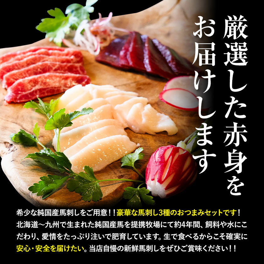 - 【ふるさと納税】馬刺し 純国産 ウマウマ 特選 おつまみ セット 専用醤油付き 50g × 3種 計150g 有限会社九州食肉産業《90日以内に出荷予定(土日祝除く)》熊本県 産山村 純国産 馬刺し 国産 熊本肥育 馬刺 馬肉 詰め合わせ 贈答用 ギフト お中元 お歳暮 送料無料