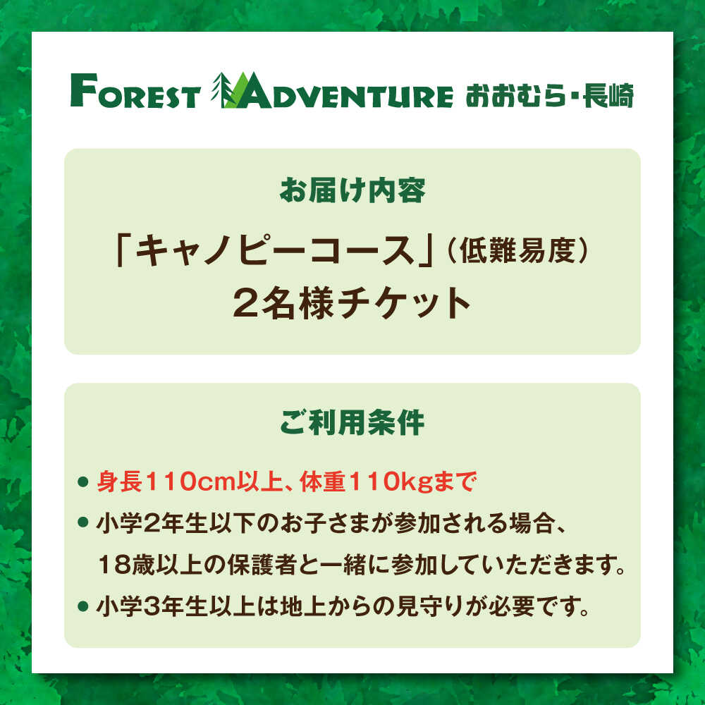 - 【ふるさと納税】家族みんなで楽しめるコース!キャノピーコース ペアチケット (2名様) / 観光 入園券 チケット 遊ぶ 体験 自然 アクティビティ アスレチック サバゲー 大人 子ども 満喫 楽しむ 迷路 キッズ 家族 友人 / 大村市 / フォレストアドベンチャー[ACCH001]