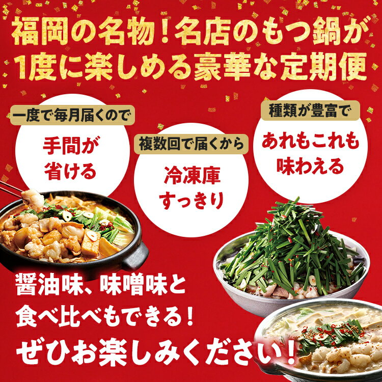 - 【ふるさと納税】定期便 もつ鍋 グルメ 定期便 約4人前 通年 3回/6回 3ヶ月 6ヶ月 食べ比べ 若杉 楽天地 おおやま やまや 頒布会 醤油 味噌 もつ鍋 国産 牛 小腸 定期発送 冷凍 ご当地グルメ 福岡 牛肉 牛もつ鍋 鍋 鍋セット みそ ホルモン もつ 冬 お取り寄せ