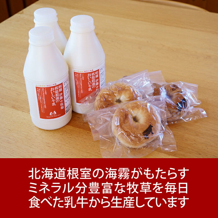 - 【ふるさと納税】 低温殺菌牛乳 800ml × 3 本、ベーグル ( クルミ・プレーン ) 各 2 個 牛乳 ミルク 生乳 低温殺菌 お取り寄せ グルメ 小麦 もちもち 北海道 根室市 ふるさと納税 A-13026