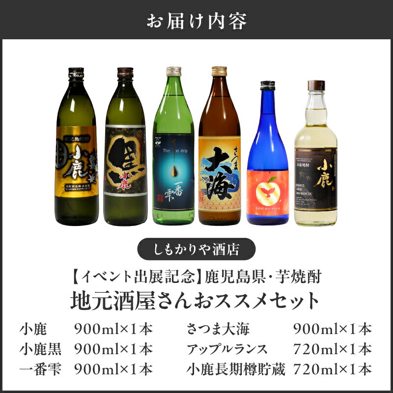 【ふるさと納税】【イベント出展記念】【小鹿酒造・大海酒造】鹿児島県 芋焼酎 地元酒屋さんおススメセット 計6本[900ml×4種×各1本・720ml×2種×各1本]本格焼酎 鹿児島 ストレート ロック ソーダ割 炭酸割り お湯割り 飲み比べ【しもかりや酒店】