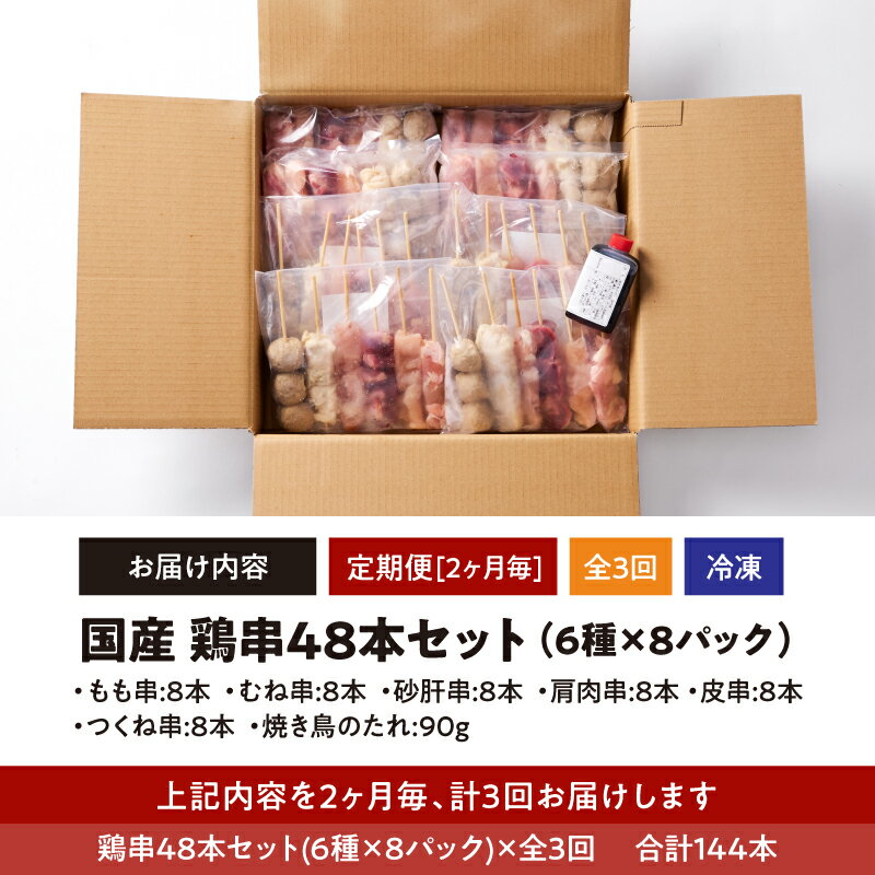 【ふるさと納税】【2か月毎定期便】国産 鶏串48本セット(6種×8パック)×全3回 計144本(鶏もも・鶏むね・砂肝・肩肉・鶏皮・つくね)定期便 お楽しみ 焼鳥 焼き鳥 鶏肉 やきとり たれ付き バーベキュー BBQ 惣菜 お弁当 冷凍 急速冷凍 個包装 小分け【株式会社カノミ】