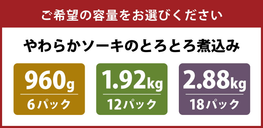 - 【ふるさと納税】【訳あり】やわらかソーキのとろとろ煮込み <選べる内容量> 6パック/12パック/18パック 1パック160g 計960g/計1.92kg/計2.88kg 豚肉付き軟骨 豚バラ 豚肉 お肉 甘辛 タレ たれ 惣菜 おかず ごはんのお供 ご飯のお供 おつまみ お酒のお供 国産 冷凍