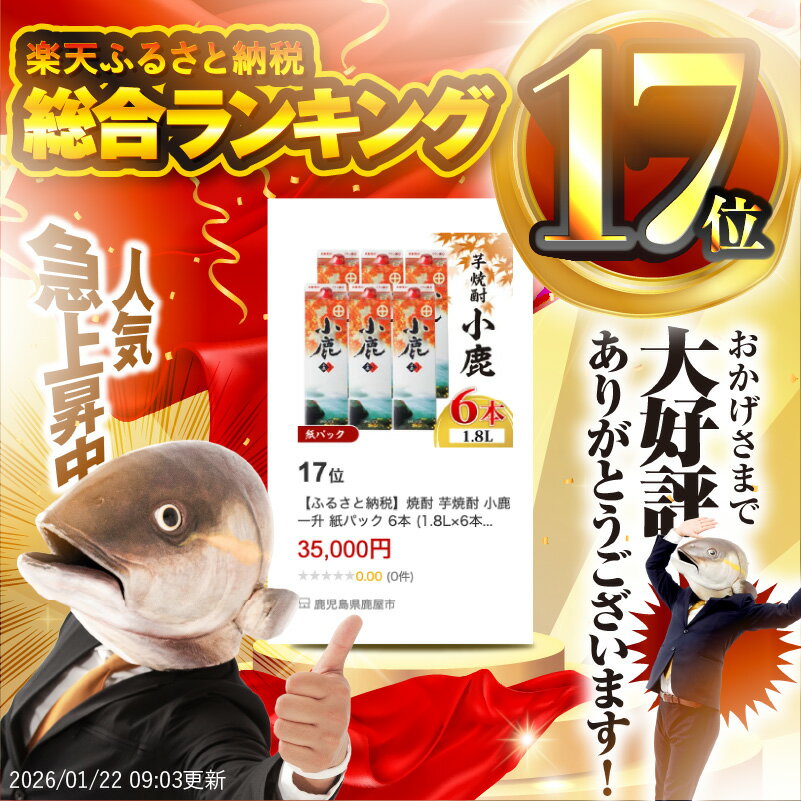 - 【ふるさと納税】焼酎 芋焼酎 小鹿 一升 紙パック 6本 (1.8L×6本) 白麹の華やかな香りとすっきりとした甘みの 本格芋焼酎! お湯割り 水割り 炭酸水割にも!【財宝】