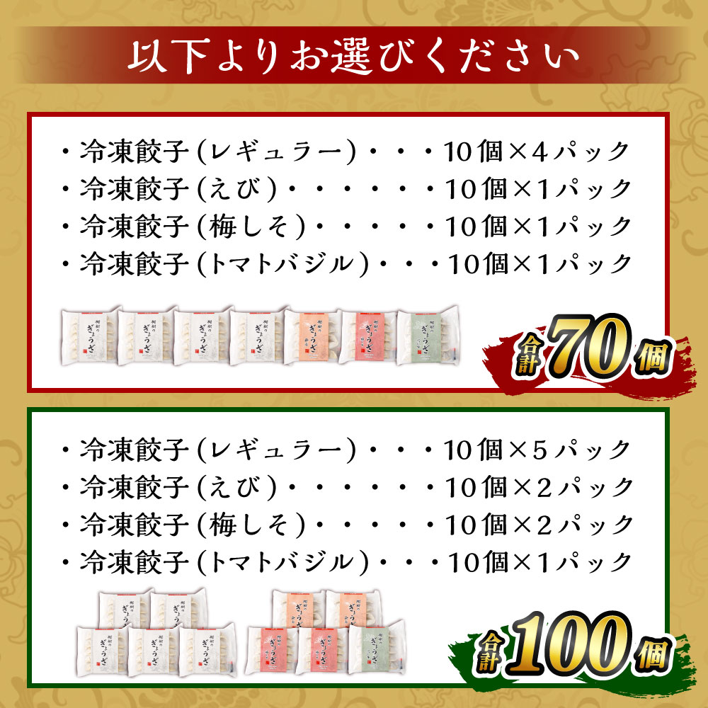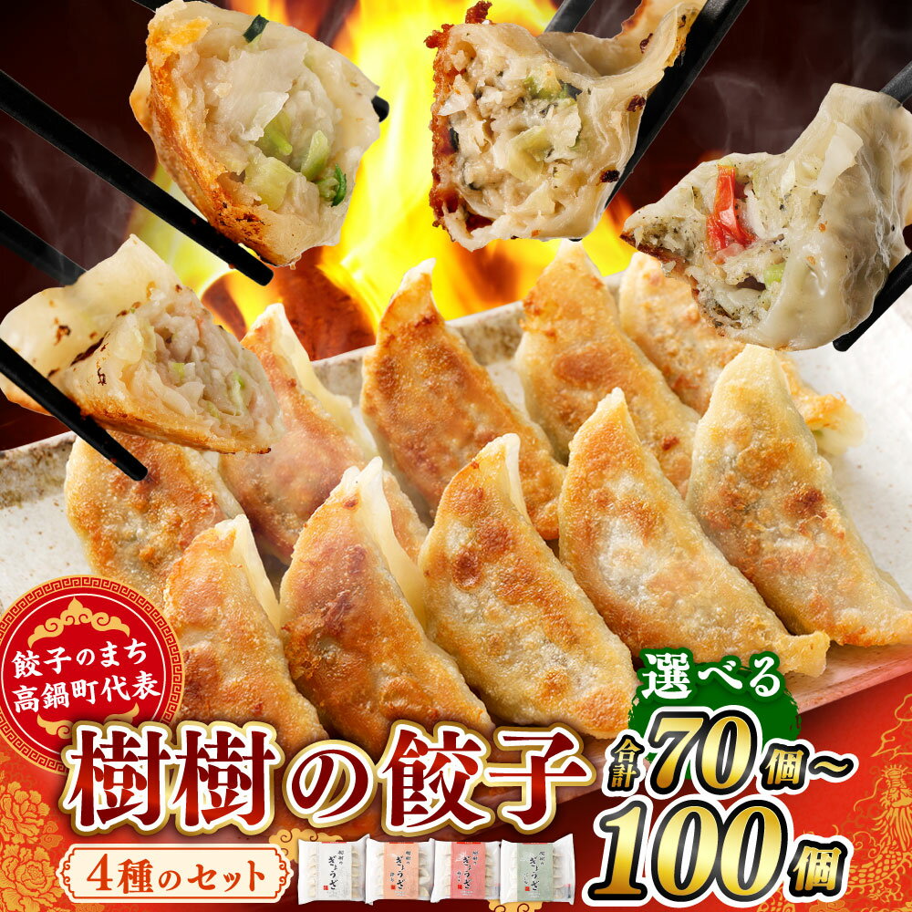 - 【ふるさと納税】【選べる容量】餃子のまち高鍋町代表<樹樹の餃子 4種セット 計70個 または 計100個>※入金確認後、翌月末迄に順次出荷します。 ギョウザ ギョーザ 中華 えび 海老 梅しそ トマトバジル 宮崎餃子 宮崎県 高鍋町【冷凍】【TVで話題沸騰!】