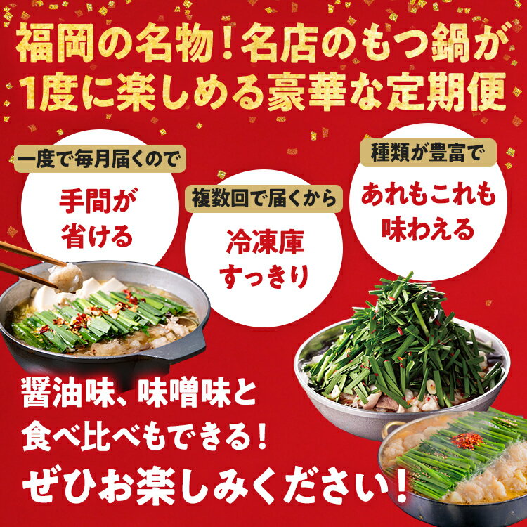- 【ふるさと納税】定期便 もつ鍋 グルメ 定期便 約2〜3人前 通年 3回/6回 3ヶ月 6ヶ月 食べ比べ 楽天地 おおやま ご当地グルメ 頒布会 醤油 味噌 もつ鍋 国産 牛 小腸 定期発送 冷凍 福岡 牛肉 牛もつ鍋 鍋 鍋セット みそ スープ付き ホルモン もつ 冬 お取り寄せ
