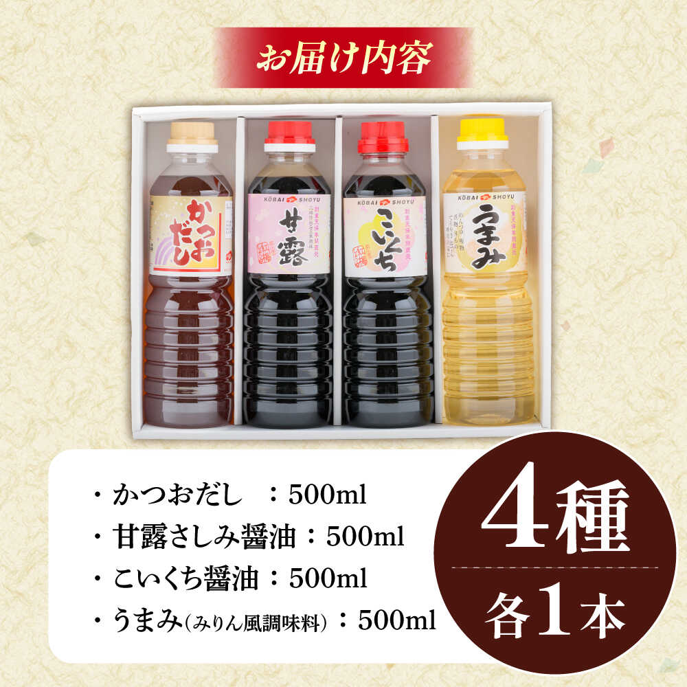 【ふるさと納税】これいいね!万能調味料4本セット【かつおだし、甘露さしみ醤油、こいくち醤油、うまみみりん】各500ml 調味料 だし かつおだし 醤油 しょうゆ こいくち みりん ギフト 詰め合わせ 島根県雲南市/有限会社紅梅しょうゆ[AICV042]