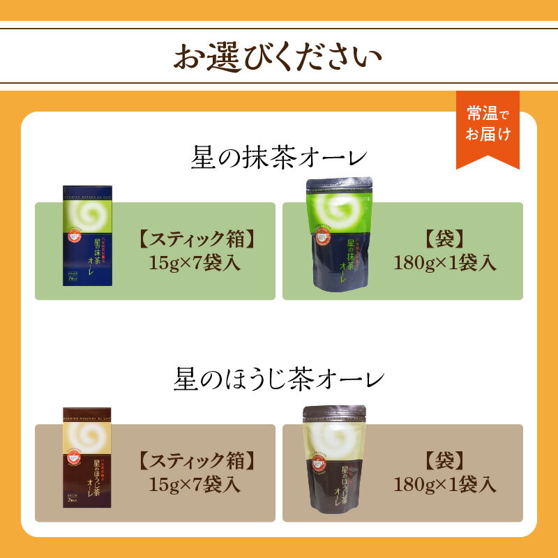 - 【ふるさと納税】【選べる種類・内容量】星の抹茶オーレ・ほうじ茶オーレ(スティック箱・袋) 【レターパック】 石臼挽き 八女抹茶 濃い抹茶 相性抜群 こだわり ほうじ茶 茶 お茶 香ばしい ハーモニー お手軽 和風 クリーミー 福岡県 八女市
