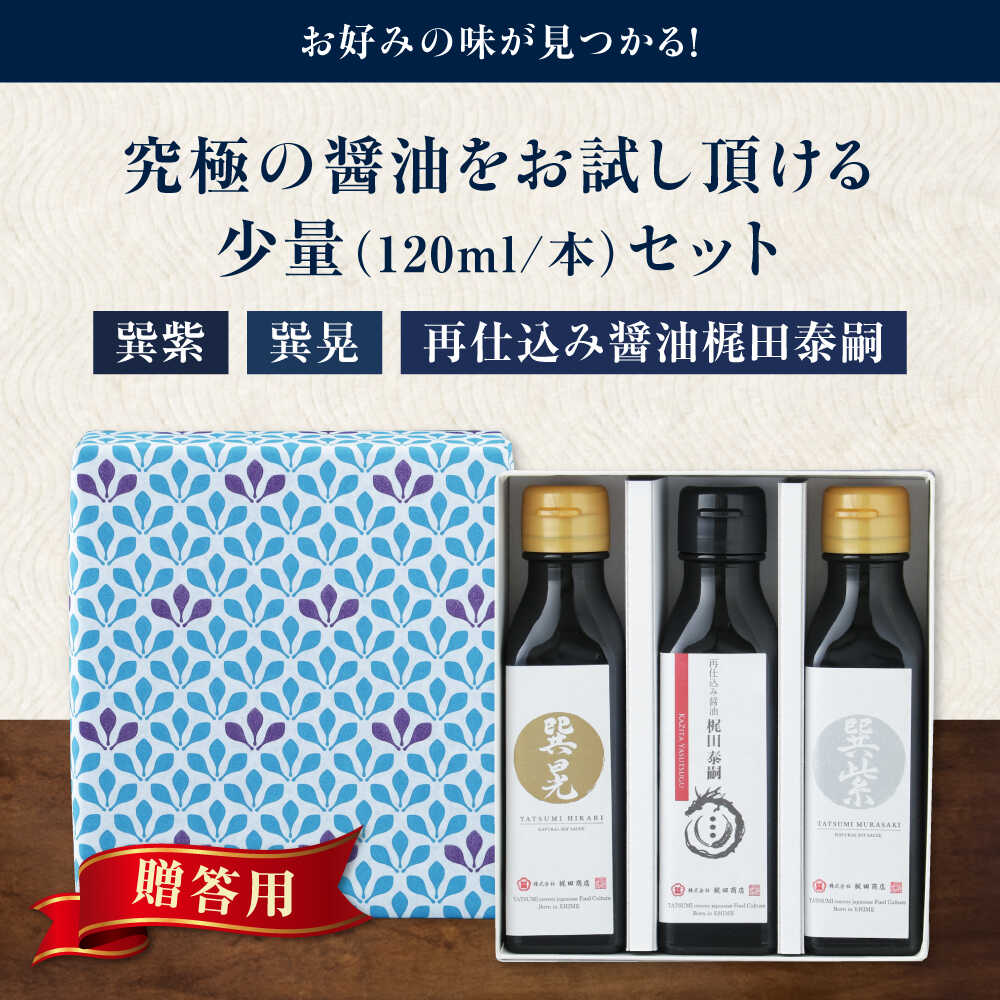 【ふるさと納税】醤油 【贈答用】 お試しセット(紫 晃 再仕込み醤油梶田泰嗣)120ml×3本セット ミニボトル だし醤油 さいしこみしょうゆ 天然醸造 本醸造 調味料 醤油 しょう油 食べ比べ 国産 料理 おすすめ 人気 愛媛県大洲市/株式会社梶田商店[AGBB049]