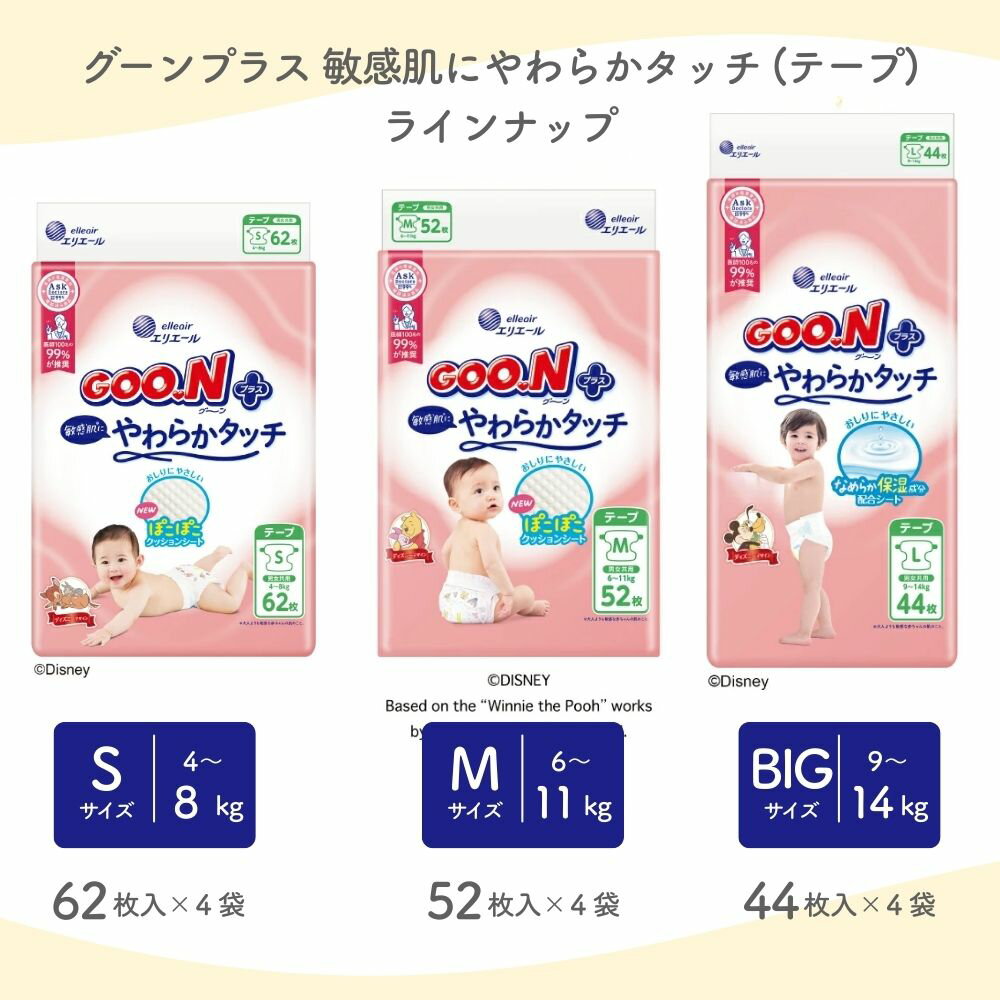 - 【ふるさと納税】おむつ グーン エリエール グーンプラス 敏感肌に やわらかタッチ オムツ テープ テープタイプ S M L 4袋 紙おむつ 紙オムツ 赤ちゃん ベビー用品 Sサイズ Mサイズ Lサイズ ディズニー 日用品 消耗品 防災 備蓄品