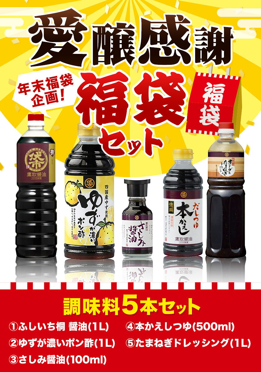 - 【ふるさと納税】醤油 愛醸感謝 福袋 セット 5本 セット 鷹取醤油株式会社《12月上旬-12月末頃出荷》岡山県 備前市 調味料 甘口 しょうゆ しょう油 ギフト 人気 年末 年始 詰め合わせ ドレッシング ポン酢 鍋 刺身 寿司 もち 焼き魚 たまねぎ ぽん酢