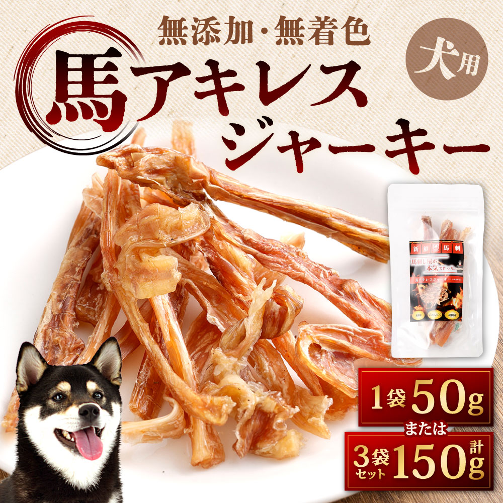 - 【ふるさと納税】犬用 馬アキレスジャーキー 1袋50g入り 選べる 1袋 / 3袋 馬アキレス ジャーキー 犬用おやつ 無添加 高たんぱく 無着色 馬 低脂肪 ヘルシー アキレス ドッグ ワンちゃん シニア犬 成犬 鉄分 ミネラル 噛みごたえ しつけ ご褒美 ペット