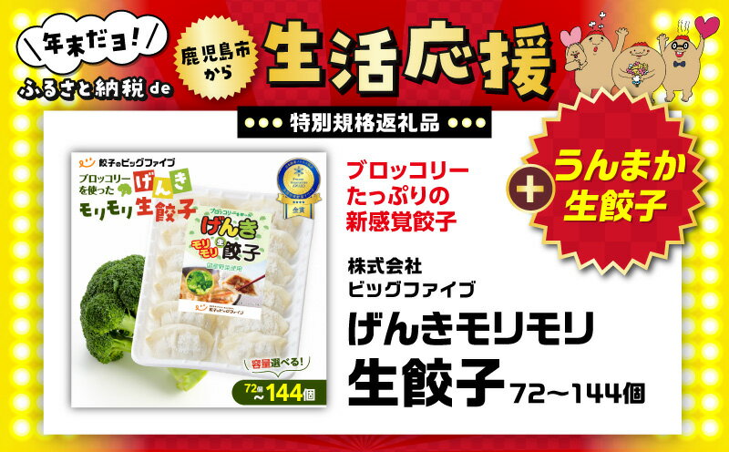 - 【ふるさと納税】【期間限定 生活応援】<容量選べる!>げんきモリモリ 生餃子 72個〜144個 餃子 ギョーザ 肉 豚肉 国産 惣菜 総菜 野菜 中華 鍋 TV紹介 全国冷凍野菜アワード 金賞 受賞 ブロッコリー 冷凍 ビッグファイブ 鹿児島 おすすめ ランキング プレゼント ギフト