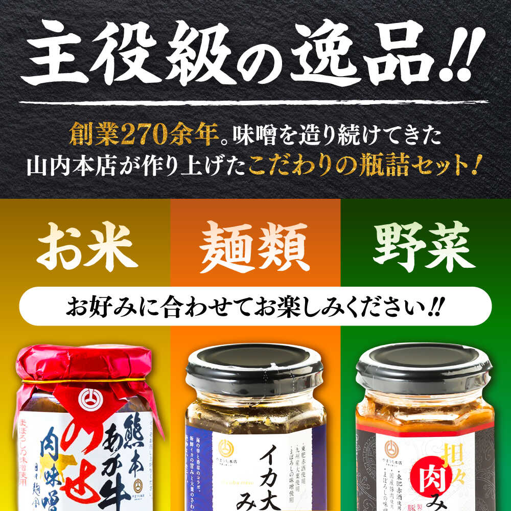 - 【ふるさと納税】瓶詰3本×2セット 瓶詰 詰め合わせ 3本セット 肉みそ 坦々 あか牛 イカ ご飯のお供 食べ比べ おかず おつまみ 熊本県 菊陽町 味噌 みそ【株式会社山内本店】[BHAE084]