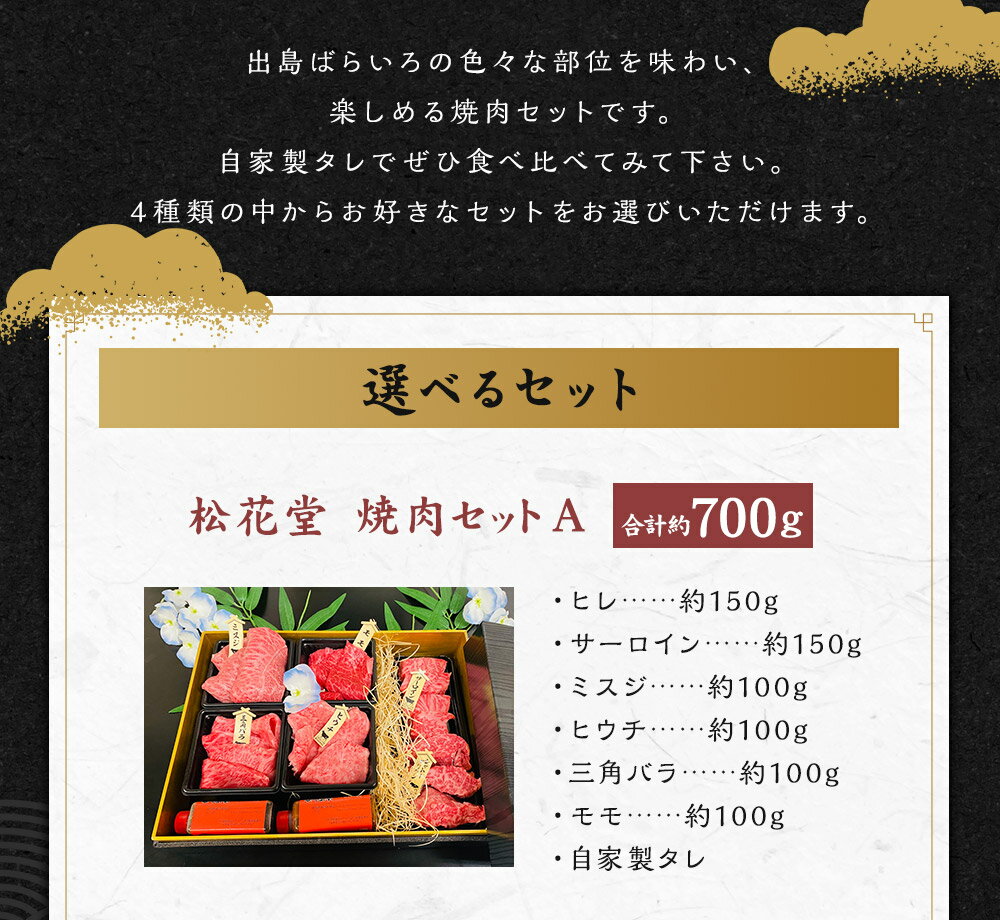 【ふるさと納税】長崎和牛 出島ばらいろ 松花堂 焼肉セット 選べる内容 ( セット A / B / C / D ) | ヒレ サーロイン ミスジ ヒウチ 三角バラ モモ カルビ 焼き肉 BBQ バーベキュー 国産 和牛 牛肉 希少部位 自家製タレ たれ ギフト 贈答 冷凍 長崎県 長崎市 送料無料