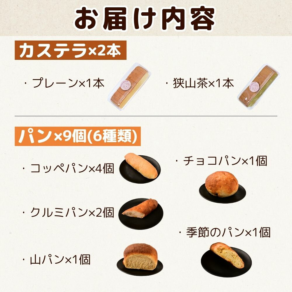 - 【ふるさと納税】カステラ カステラとパンセット | カステラ パン コッペパン クルミパン チョコパン レモンパン チャイパン チョコ くるみ マカダミアナッツ ホワイトチョコ レモン 菓子 スイーツ 全粒粉 山パン 菓子パン 冷凍パン お土産 令子の手作り工房 埼玉県 狭山市
