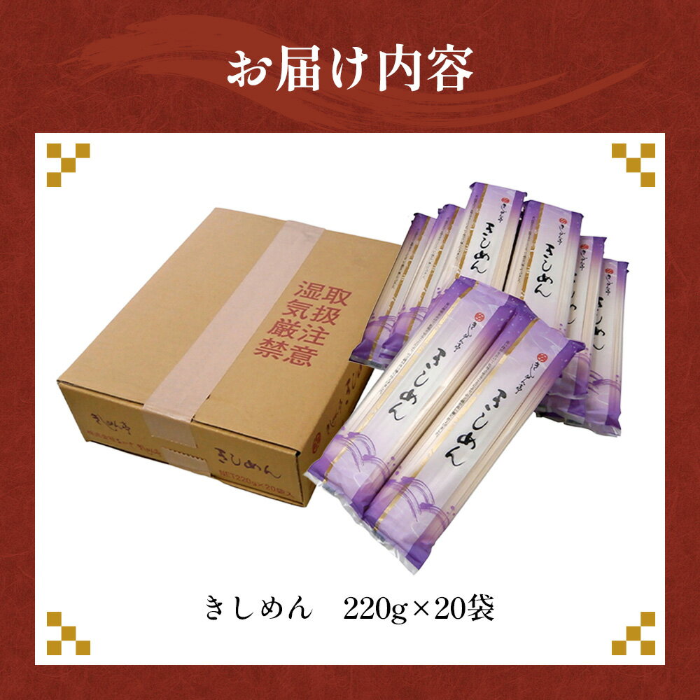 - 【ふるさと納税】きしめん亭 きしめん 220g×20袋 / きしめん うどん つるつる コシ のど越し 食感 麺 乾麺 なごやめし 名古屋めし常温保存 家庭用 簡単調理 お取り寄せ 和風麺 ご当地 麺セット 送料無料 愛知県 No.213