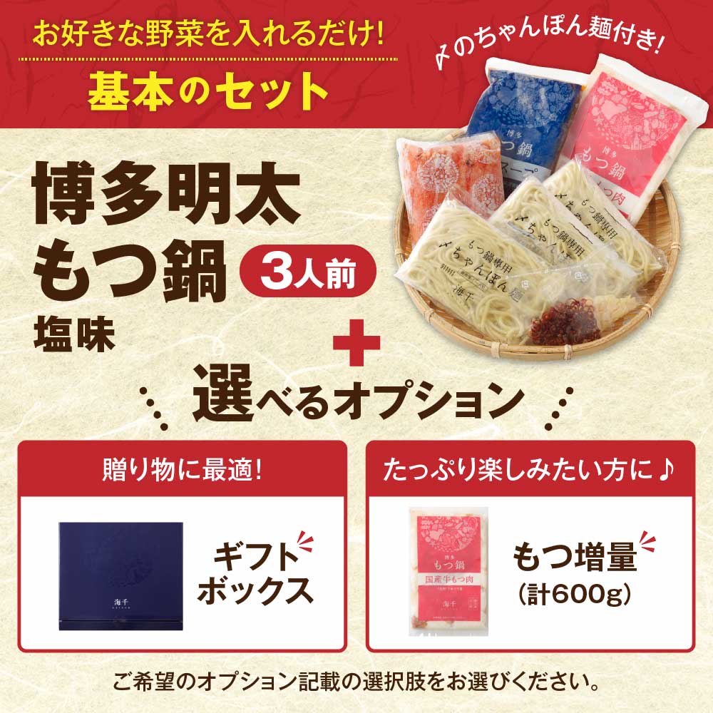 - 【ふるさと納税】<選べる>博多明太もつ鍋 塩味 3人前セット【海千】 ギフトボックス もつ増量 国産牛もつ 国産牛もつ 明太子 もつ鍋 セット ちゃんぽん麺 美味しい 3人前