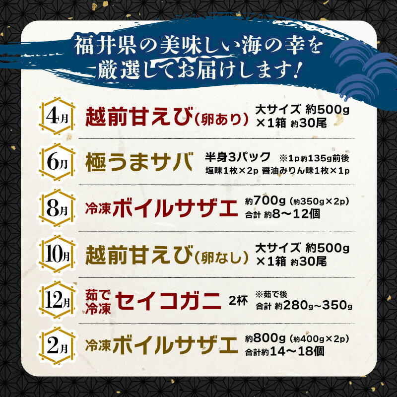 - 【ふるさと納税】定期便 ≪年6回お届け≫ 海鮮定期便 偶数月にお届け 海鮮福袋 【産地直送 甘えび 甘海老 アマエビ サザエ さざえ セイコガニ かに 蟹 サバ 鯖 海の幸 貝 甲殻類 海鮮 魚介 酒の肴 つまみ 絶品 冷凍 福井】お買い物マラソン 買い回り [m17-g009]