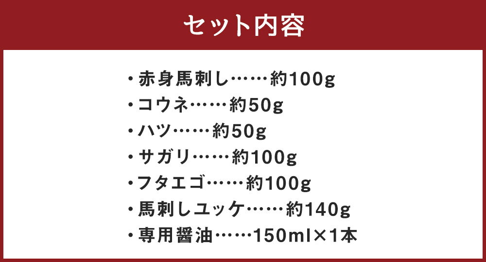 - 【ふるさと納税】【桜屋】馬刺し 6種セット 赤身 サガリ ハツ フタエゴ コウネ(タテガミ) 馬ユッケ 計540g 専用醤油付き 150ml×1本 馬肉 お肉 馬刺 希少部位 詰め合わせ しょうゆ 冷凍 熊本県 水上村 送料無料